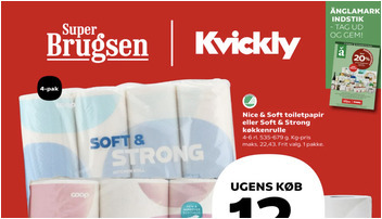SuperBrugsen tilbyder Nice & Soft toiletpapir eller Soft & Strong køkkenrulle til kun 12 kr. pr. pakke. Hver pakke indeholder 4-6 ruller, og tilbuddet gælder fra fredag den 20. februar til og med torsdag den 26. februar 2026.